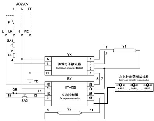 | 使用说明:虚线部分接线由用户自己来完成。L为充电电源,不受K开关控制一直处于充电状态。LK为控制电源,由K开关来控制灯亮与灭,有电时电池充电Y1、Y2点亮,停电时应急控制器工作,Y2点亮,Y1熄灭此时电路进入应急状态。 Instruction: The dashed part is completed by the user. L is charging power. It is not controlled by switch K and is always in the state of charging. Lk is control power that controls on and off of the light by switch K. When power is on, battery is charged and Y1,Y2 are enlightened; when power is cut, emergency controller starts to work and Y2 is enlightened while Y1 quenches. Then the conduit goes into emergency state. |
